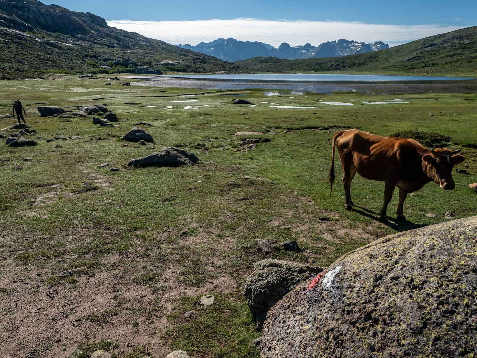 Leichter Abschnitt auf sehr schön zu gehenden Wegen. Der Weg vom Refuge führt angenehm ansteigend bis zum Lac de Nino, dem Highlight der Etappe. Der Moorsee liegt auf 1.740 Meter Seehöhe, ist warm und lädt zum Baden ein. Davor passiert man die wunderschöne Pozzines. Nach dem Lac de Nino folgt ein kurzer, etwas steilerer Anstieg, danach geht es nur noch bergab bis zum Castello di Vergio.