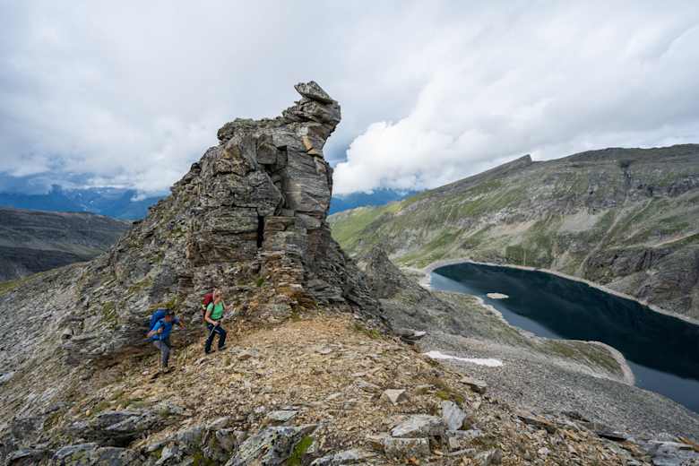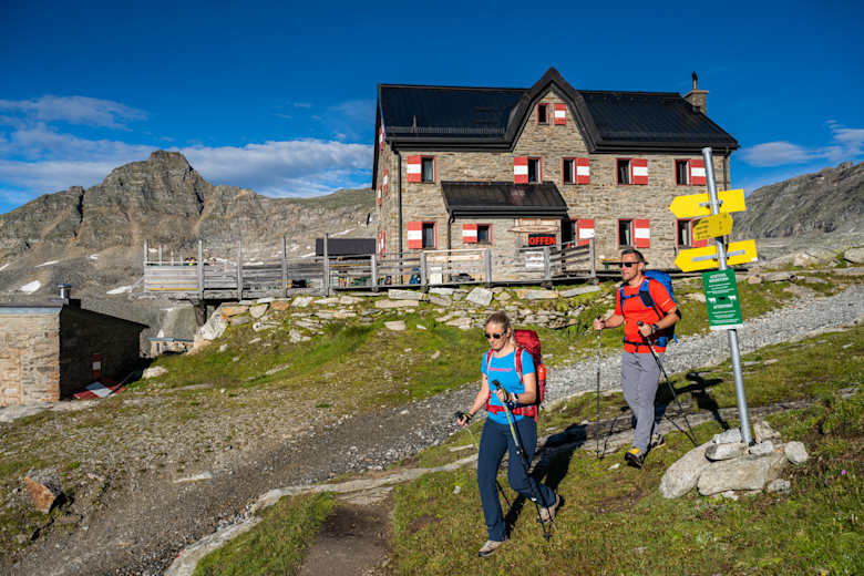 Ein Stück unterhalb der Hütte zweigt der Tauernhöhenweg rechts ab und man wandert über die Niedere Scharte, 2.696 m. Nun geht es abwärts - den Hochwurtenspeicher vor sich. An der Weggabelung hält man sich links und erreicht das Ombrometer. Hier nimmt man den am Hang verlaufenden Weg, der direkt zur Duisburger Hütte, 2.572 m, führt.