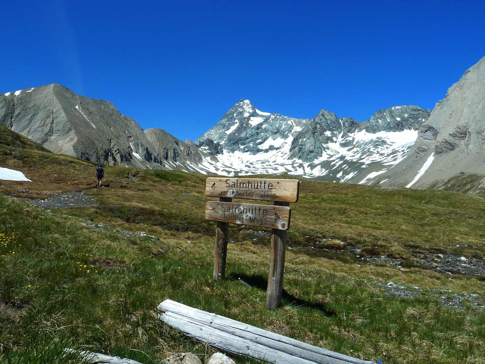 Hier hat man zwei Möglichkeiten, um zur Salmhütte zu gelangen. Entweder man nimmt den rechten Weg, Nr. 45, der abwärts in das Tal und auf der anderen Seite wieder empor zur Hütte führt und etwas leichter ist oder man nimmt den rechten Weg, der drahtseilgesichert entlang der steilen und gerölligen Felswände abwärts und in einem Rechtsbogen wieder ansteigend zur Salmhütte führt.