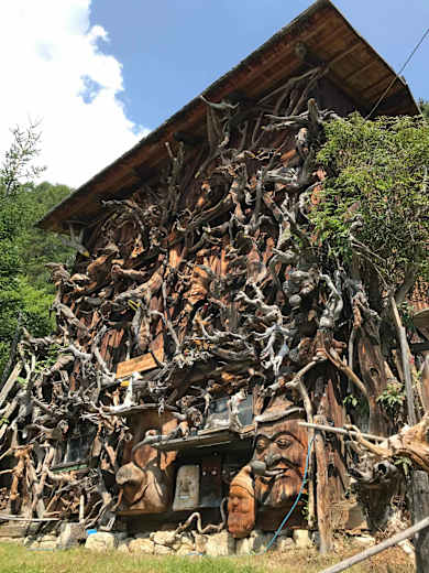 Wieder geht es durch den Wald, vorbei an einer alten Mühle und über einen kleinen Bach, der mit hunderten geschnitzten Holztieren, Wasserrädern und Wasserrinnen versehen ist... ein Sammelsurium an kleinen, verspielten Kostbarkeiten und alten, bäuerlichen Gegenständen.