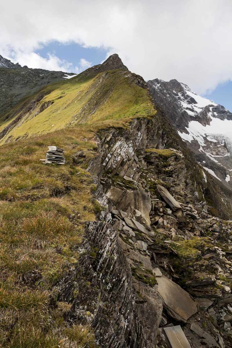 Zur Hochkarscharte hinauf wie auf der anderen Seite zum Wiesbauerweg hinüber weisen uns große Steinmänner im Gelände den Weg. Von der Hochkarscharte zieht sich die Quirlwand zum Quirl, hier ist im Abstieg darauf zu achten das wir der Wegspur nicht in die nächste Scharte folgen, sondern vorher direkt nach Süden ins Umbaltal absteigen.