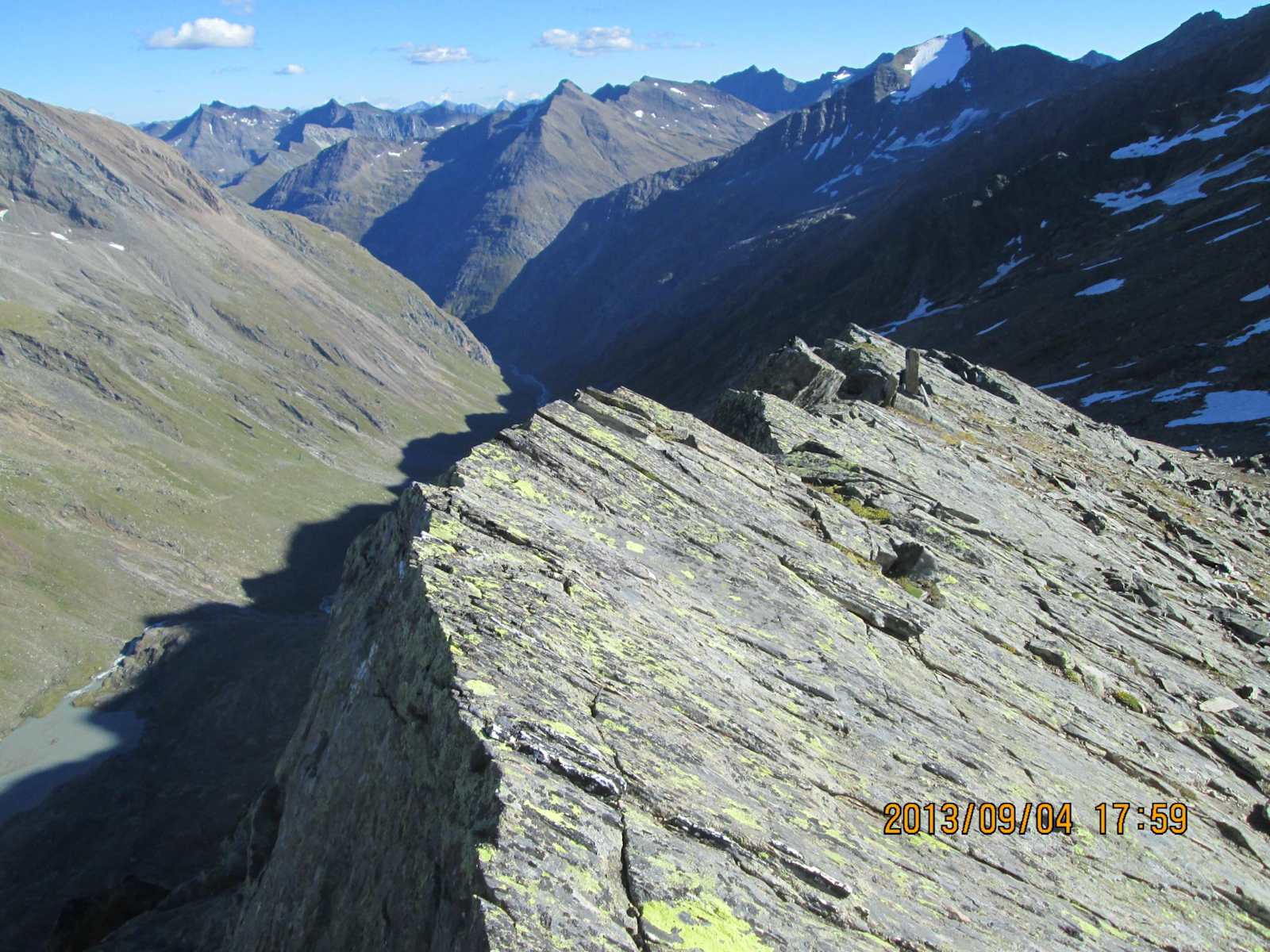 Man überschreitet die Scharte um einige Meter und wendet sich dann wieder rechts in nördlicher Richtung ins grobe Blockstein hinein, während der Weg abwärts zur Lenkjochhütte führt. Markierungen finden sich hier nicht mehr, aber einige Steinmännchen weisen uns durch das Blockwerk und entlang des Grates den Weg bis zum Gipfel.