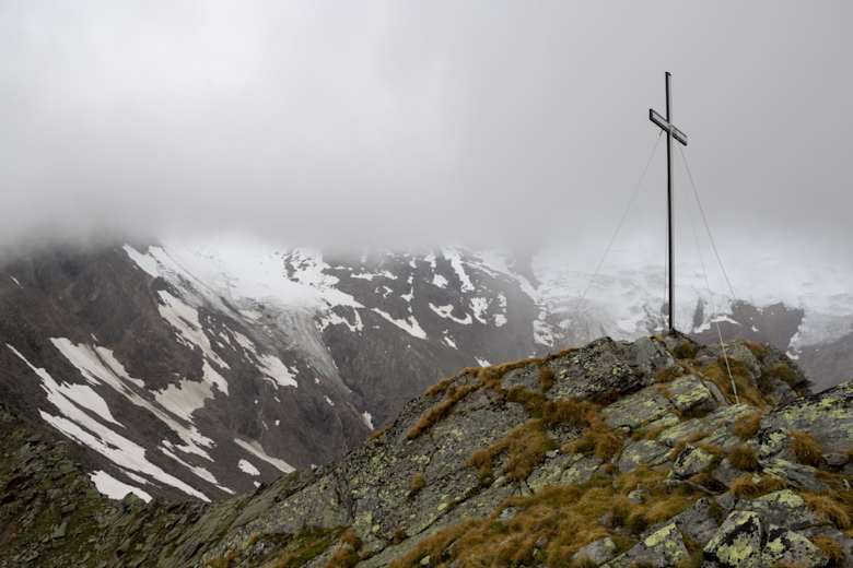 Die Gesamtmarkierung dieser Runde ist zwar schon altersschwach, aber bei schneefreien Verhältnissen mit klarer Sicht ist der Pfad kaum zu übersehen. Insbesondere die hier an vielen Stellen gesetzten Steinstufen erleichtern den relativ kurzen Aufstieg. Bereits einige Meter vor dem Gipfel ist der aus Feinschotter bestehende rückseitige Abstieg sofort zu erkennen. Nach den ersten steileren 20 Metern führt der Weg auf etwa gleichbleibender Höhe an einer etwa fünf Meter langen Sicherungsstelle vorbei. Der folgende Abschnitt ist mit drei größeren Steinmännern markiert und führt bis zu einem Wegschild, das den Weg zurück zur Essener und Rostocker Hütte weist.