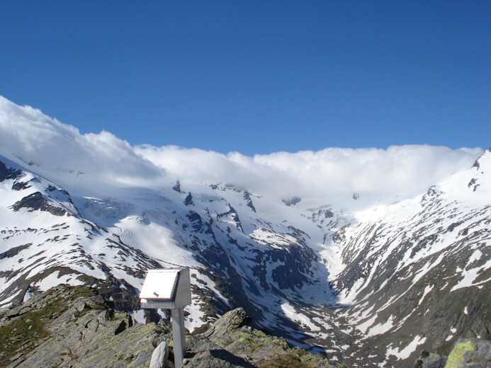 Direkt an der Winterhütte des Essen-Rostocker-Hauses beginnt der Aufstieg entlang der Seitenmoräne des Simonygletschers. Hier überlagert sich zunächst der Weg Nr. 920 mit dem Weg Nr. 919 unserer Rundtour, dem Carl-Bremer Weg. Wir folgen der Moräne in westlicher Richtung bis zu deren Ende von der sich im ersten felsigen Abschnitt der Weg an einem Wegschild gabelt. Von hier beginnt links unverkennbar in schon südlicher Richtung der Anstieg zum Gipfel.
