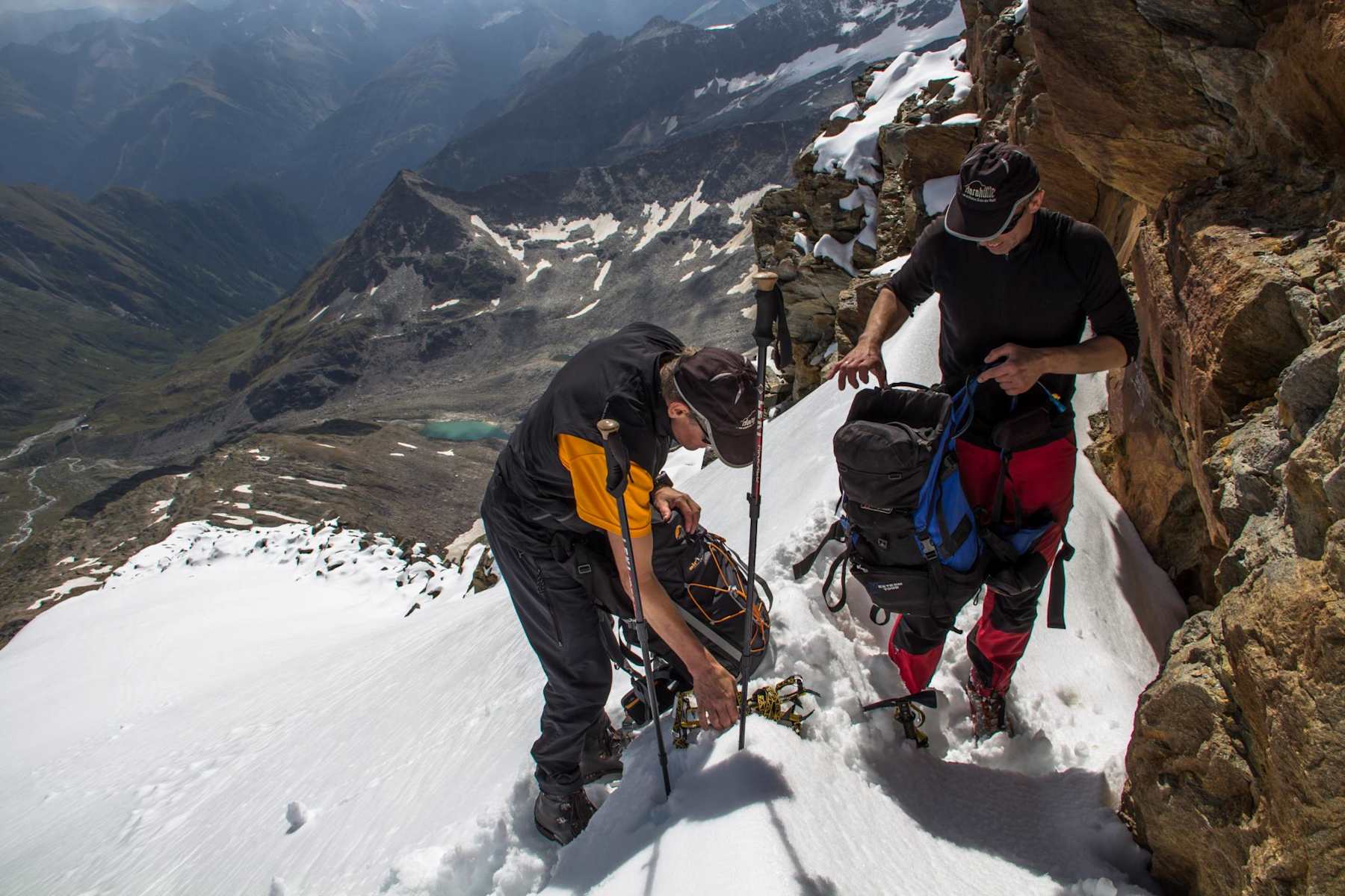 Durch das Geröllfeld geht es nun auf den Felsrücken bei dem wir uns im Zweifel eher links halten, um nicht ins steilere Eis zu gelangen und dann über die spaltenarmen Gletscher zur Östlichen Simonyspitze, 3.448 m, hinauf.