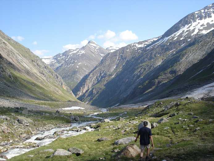 Im Talgrund führt eine Brücke über den Maurerbach, dort folgt man auf der anderen Seite dem Fluss abwärts zur Essener-Rostocker Hütte, die am Fuß imposanter Gletschergipfel liegt. Überzwanzig Dreitausender ragen in ihrer Umgebung empor. Von dersonnigen Terrasse der Hütte hat man dann das Rostocker Eck und die Simonyspitzen im Blick. Nach dem ersten Ausruhen bietet sich ein Abendspaziergang zum Simonysee an (ca.45 Min.) – ein idyllischer Ausklang dieses Tages.
