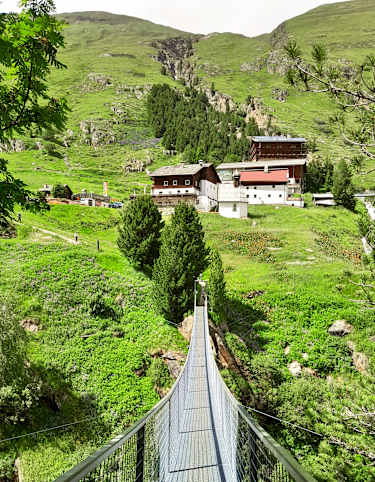 Vom kleinen Ort Vent wandert man weiter Richtung Talschluss. Hier findet man sogleich viele Wegweiser, die auch den Weg hinauf zur Martin-Busch-Hütte weisen. Man hält sich leicht links und wandert über einen recht breiten Weg aufwärts.