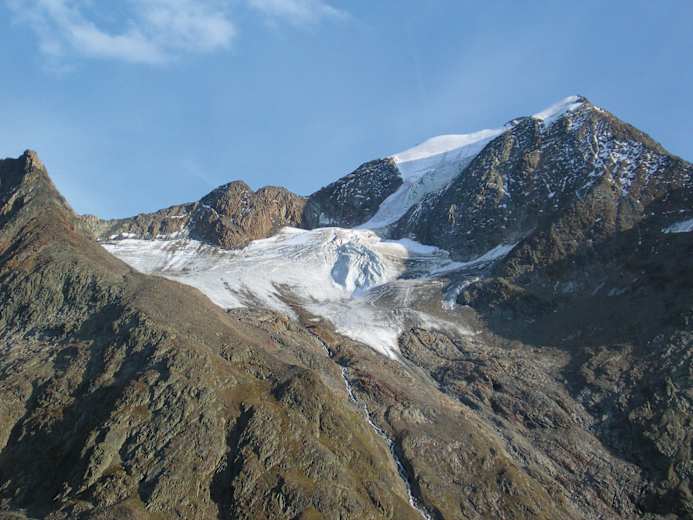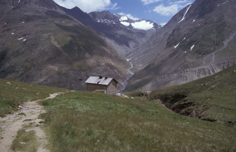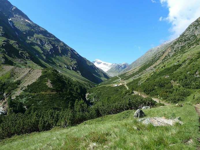 Nach rund 700 m auf dem eigentlich alten, aber provisorisch instand gesetzten Weg, quert man wiederum die Niedertalache und erreicht über einen neuen Weg den bekannten Fahrweg, der nun direkt zur Martin-Busch-Hütte auf 2.501 m führt.