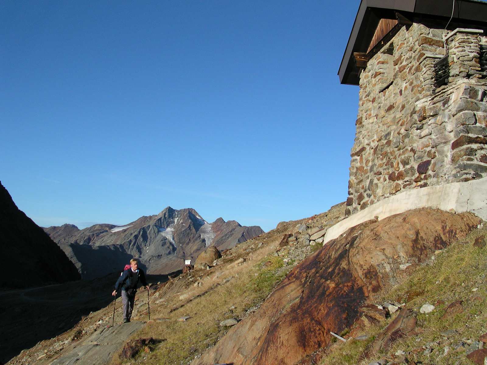 Man quert den Bach, der vom Kreuzferner heraussprudelt und kurz danach den Hochjoch-Bach, zum Glück über eine Brücke. Kurz darauf sieht man bereits das Hochjochhospiz, man muss aber noch einige Höhenmeter in das tief eingeschnittene Tal absteigen und zum Schluss geht es noch ein paar Meter aufwärts bis zum Etappenziel, dem Hochjochhospiz auf 2.413 m.