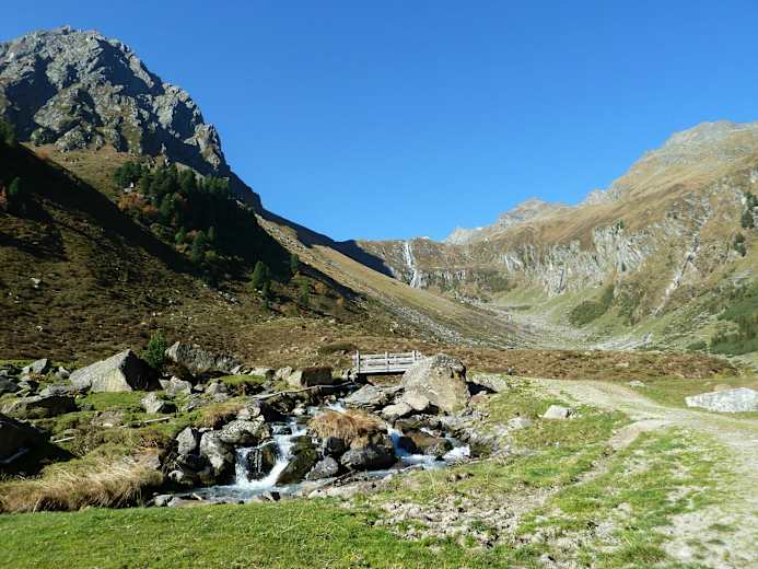 Ab hier hat man bereits einen Blick auf die Neue Regensburger Hütte, die oberhalb der nächsten Steilstufe thront. Der Anstieg entlang des Wasserfalls ist steil, aber wunderschön - vor allem im Frühsommer, wenn die Almrosen blühen.