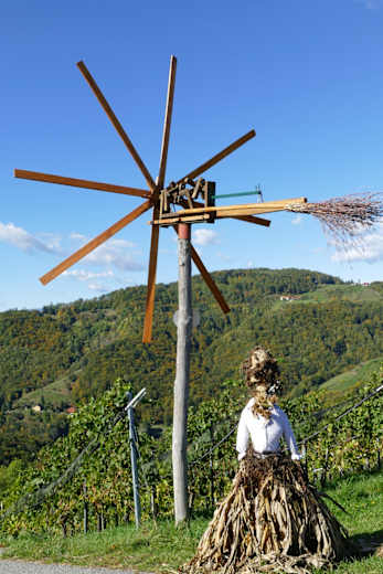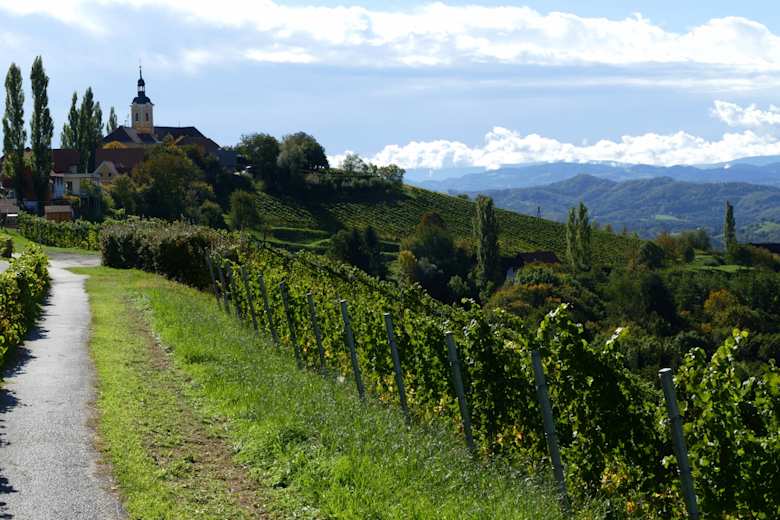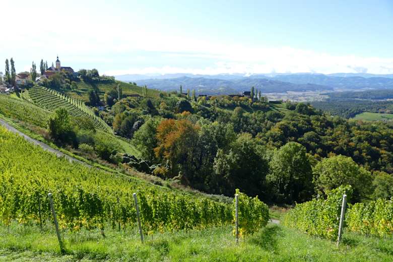 Steiler Weinberg in Kitzeck Foto: weinwandern.at Die Buschenschänke lädt zur Einkehr ein. Foto: weinwandern.at Blick in Gauitsch Foto: weinwandern.at Im Herbst waren die Edelkastanien reif. Foto: weinwandern.at Der Weg zur Kirche in Kitzeck Foto: weinwandern.at Sehenswert: der Klapotetz Foto: weinwandern.at Blick ins Sausal Foto: weinwandern.at