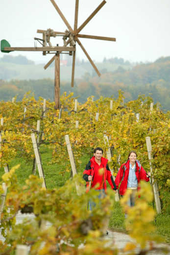 Durch den Wald geht es dann wieder bergauf, vorbei an Weingärten kommt man nun zum Weingut Kollerhof am Eichberg. Hier gibt es im Herbst auch einen Sturm- und Kastanienstand, bei dem man sich stärken kann! Weiter geht es durch den Weinkulturgarten, einen Wanderpfad mit viel Wissens- und Erlebenswerten Infos zum Thema Wein. Am Ende des Lehrpfades erreicht man den „Modernen Klapotetz“ – eine moderne Version des traditionellen Südsteirischen Klapotetz. Letzterer war früher essentiell, um die hungrigen Vögel im Herbst aus den Weingärten zu vertreiben, heute ist er eines der Wahrzeichen der Südsteiermark.