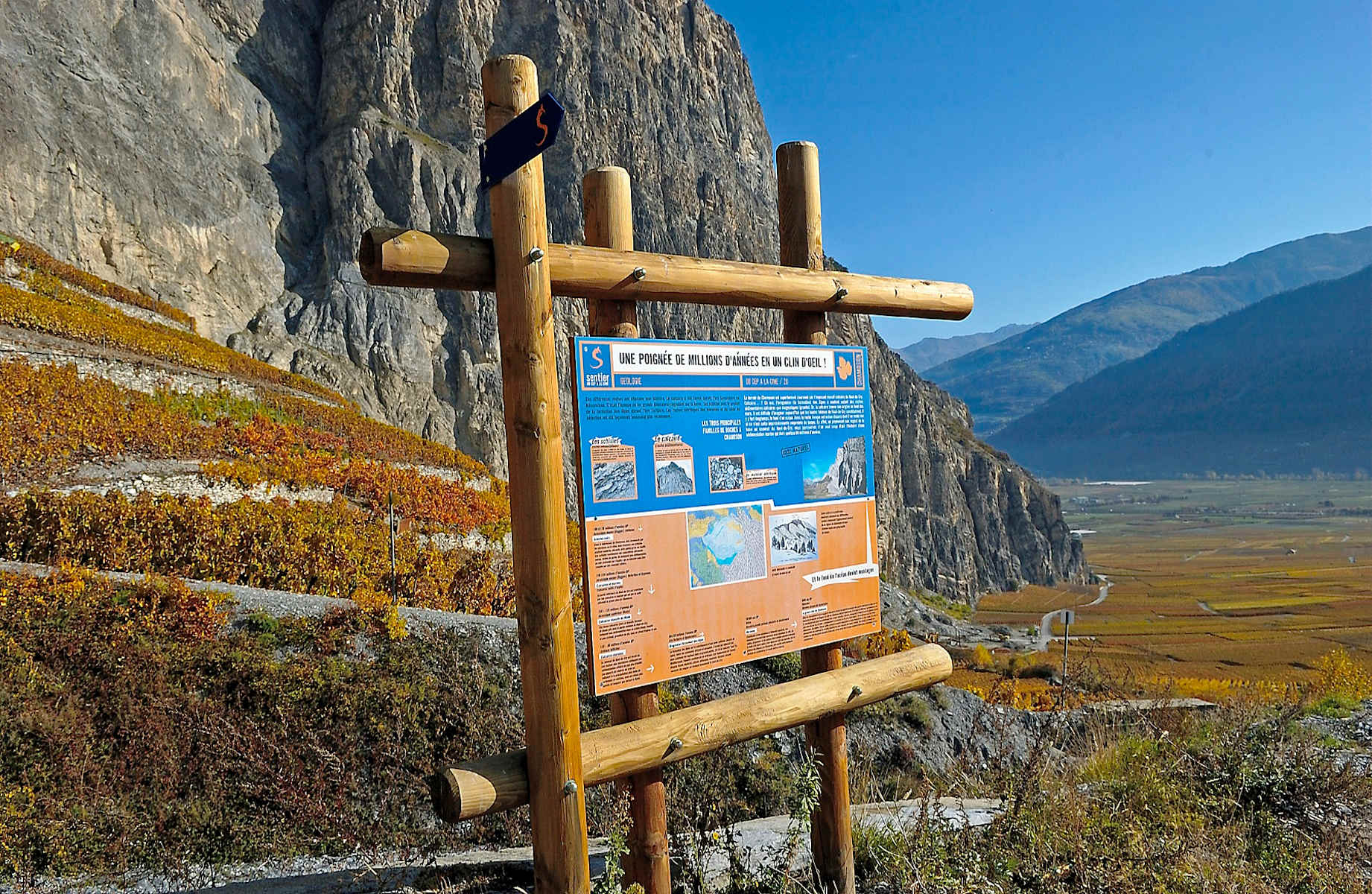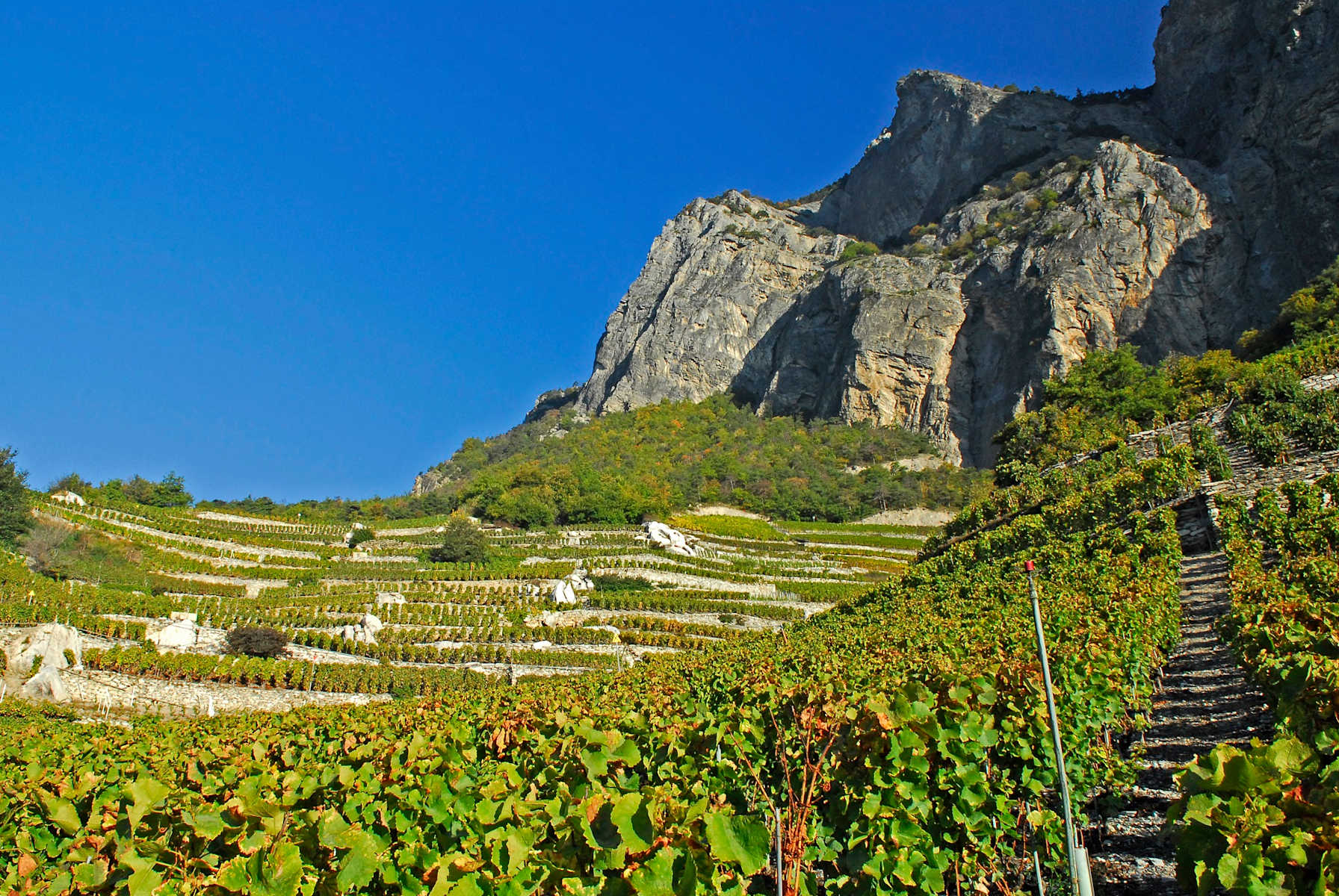 Weiter geht es zu den imposanten Felswänden von Haut-de-Cry. Entlang der Sizeranche steigt man forsch den Hang hinauf und befindet sich bald inmitten prächtiger Weinterrassen und bewundert die atemberaubende Aussicht auf den weiten Talboden.