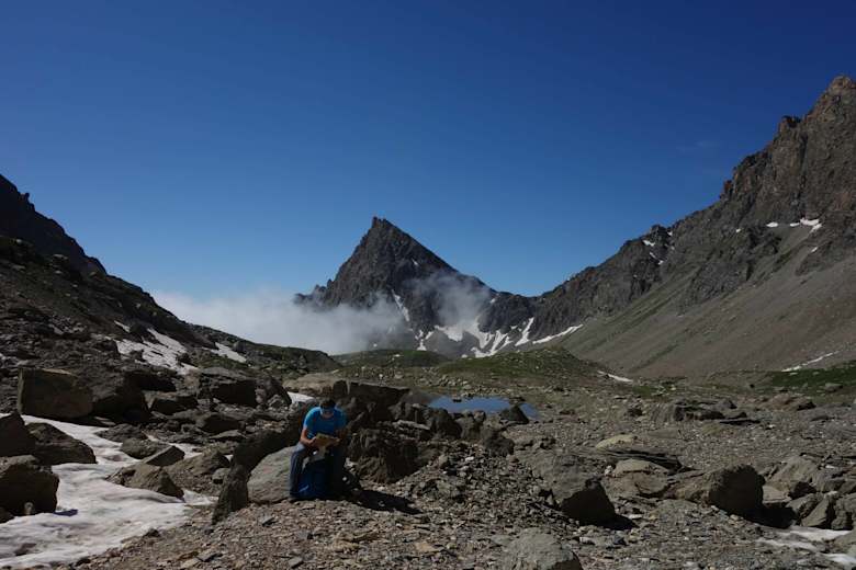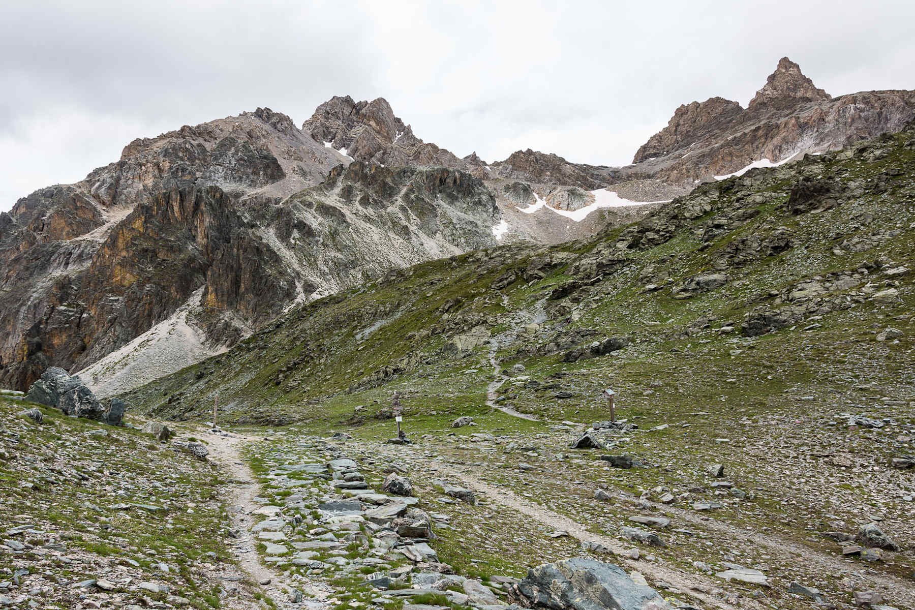 Ein Stichweg führt hier nach Norden zum Colle de Gippiera (2.930 m), dem Grenzübergang ins französische Vallée de l’Ubaye. Dort tut sich ein prächtiger Blick über die wilde Berglandschaft der französischen Seealpen mit dem nahen Lac des Neuf Couleurs auf. Rechts geht’s auf den Gipfel des Tete de la Frema (3.151 m).