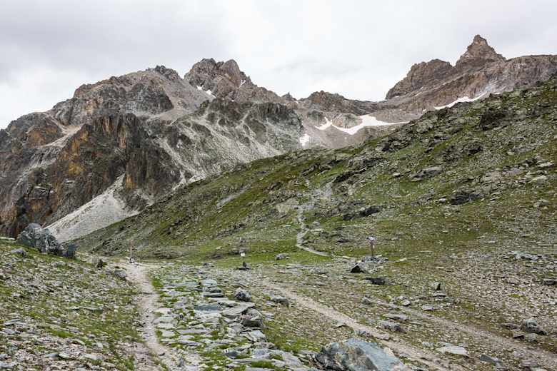 Ab dem Parkplatz geht es 200 m entlang der Schotterstraße (Markierung Sentiero Icardi, T15, Variante PO blau-gelb), nach einer U-Kurve zweigt der Weg links ab. Jetzt geht es zunächst durch das Valle dell’Infernettostark bergauf. Bei einer Wegteilung auf 2.600 m geht es links ab. Es wird sehr steil, ein Stück vor dem Colle dell’Infernetto (2.783 m) ist mit Ketten gesichert.