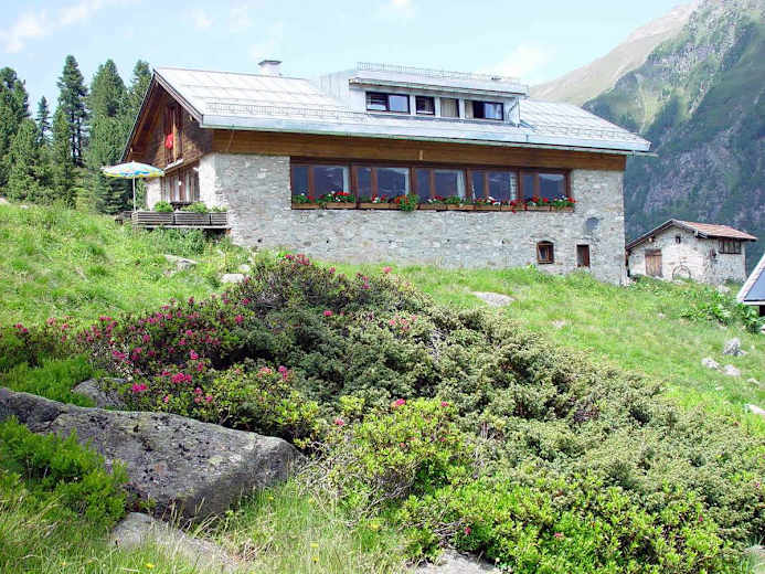 Man geht ein kleines Stück entlang der Straße zurück und folgt dann dem Weg, der in Serpentinen unterhalb der Materialseilbahn aufwärts führt. Nach rund 30 min - ohne Gepäck - hat man die beiden Hütten auf 1.942 m erreicht.