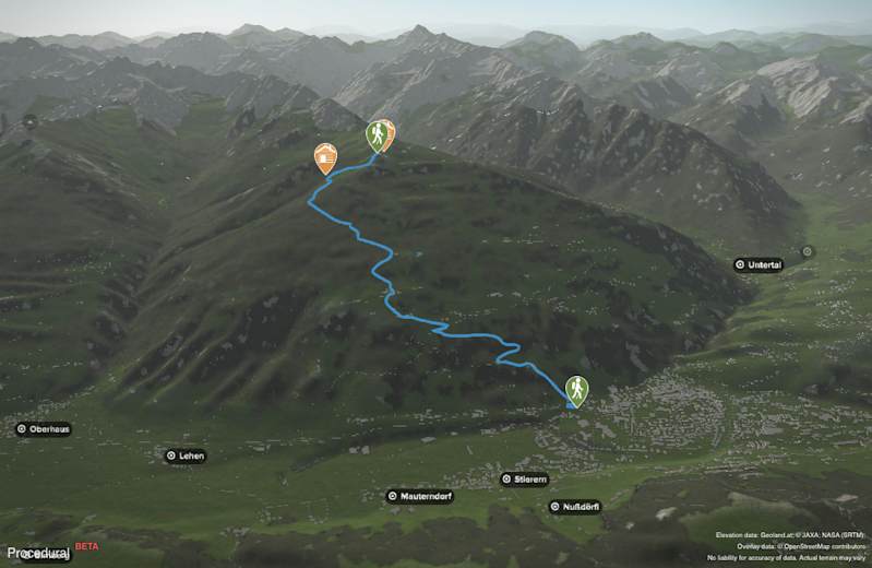 Immer der Beschilderung folgend quert man mehrfach die Straßen, die sich den Hang aufwärts schlängeln. Der Weg führt durch Wald und über Wiesen, im oberen Bereich auch ein Stück über die Skipisten. Vorbei an der Skihütte Almrausch, erreicht man schließlich die Schladminger Hütte auf 1.830 m.