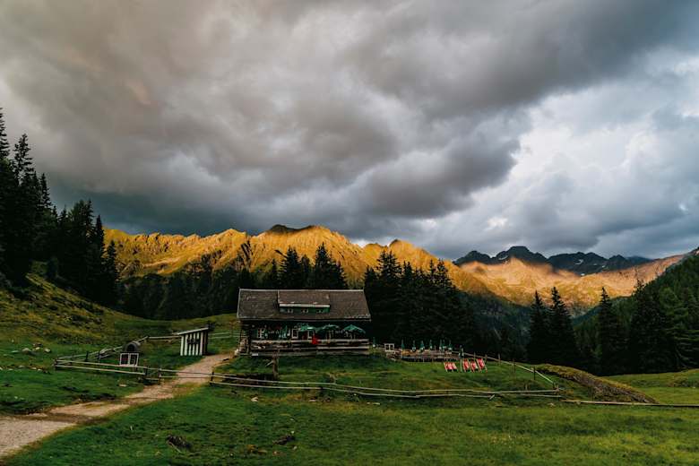Ab der Alm führt nun sowohl ein Forstweg, als auch ein Wanderweg bergan zur Hütte. An der Bushaltestelle zweigt man rechts ab, überquert den Bach und nimmt den Wanderweg, der in der Kurve rechts von der Fahrstraße abgeht.