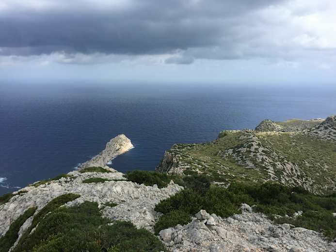 Auch der Abstieg ist von Steinmännern markiert. Nach einer kurzen Traverse folgt man dem langgezogenen Bergrücken Richtung Meer. Immer wieder bieten sich schöne Aussichten auf das Vall de Ternelles, die Bucht Cala Castell und die schmale Halbinsel der Punta Galera.