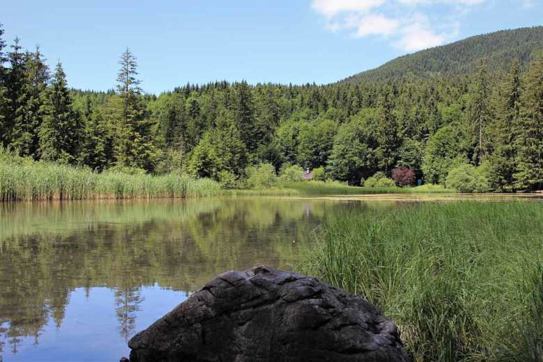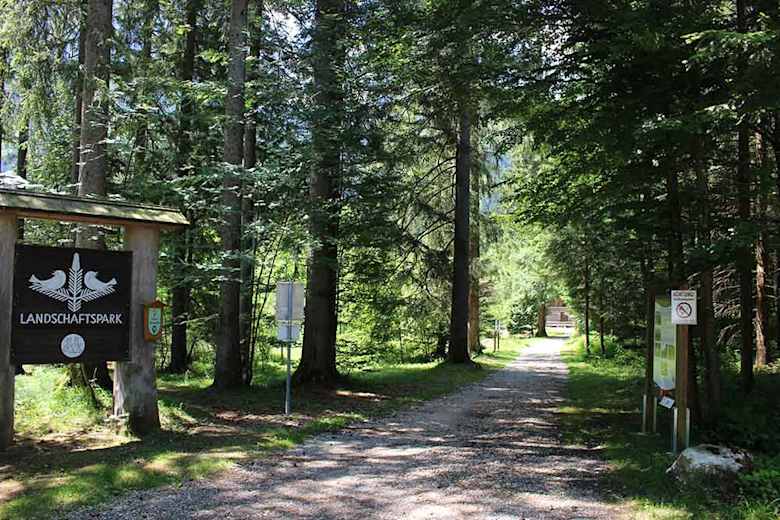 Der gut ausgebaute WohlfühlWeg startet direkt vom kleinen Parkplatz vor dem See. Vom kleinen Waldstück aus, mit kurzem Seezugang, führt der Weg weiter zu einer Raststation. An dieser gibt der Weg einen schönen Blick auf den See und die umliegenden Berge frei.