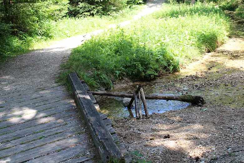 An der Raststation vorbei, kommt man nach wenigen Metern vor einer kleinen Holzbrücke zur Station 1 des WohlfühlWeges. Hier mündet der Aurachbach in den Taferlklaussee. Weiter führt der Weg nun durch den Wald ein wenig abseits des Sees. Auf halben Weg gelangt man im Waldstück zur Station 2 an einer Rastbank.