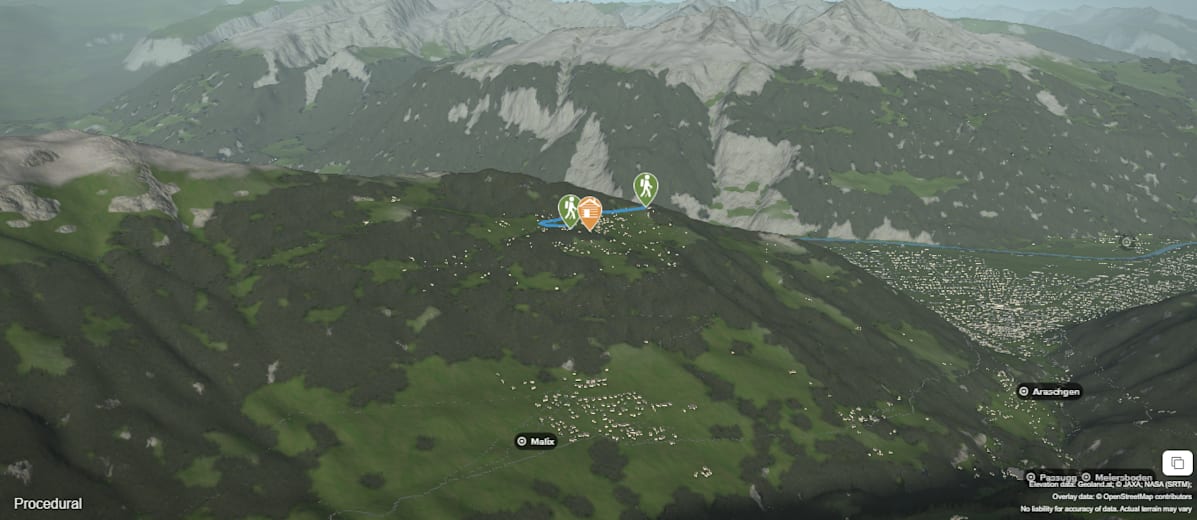 Von der Bergstation dem Riedbodenweg Richtung Brambüesch folgt. Hinter einer langgezogenen Linkskurve zweigt - nahe dem Malixerhof - rechter Hand ein kleiner Weg zum Naturfreundehaus ab.