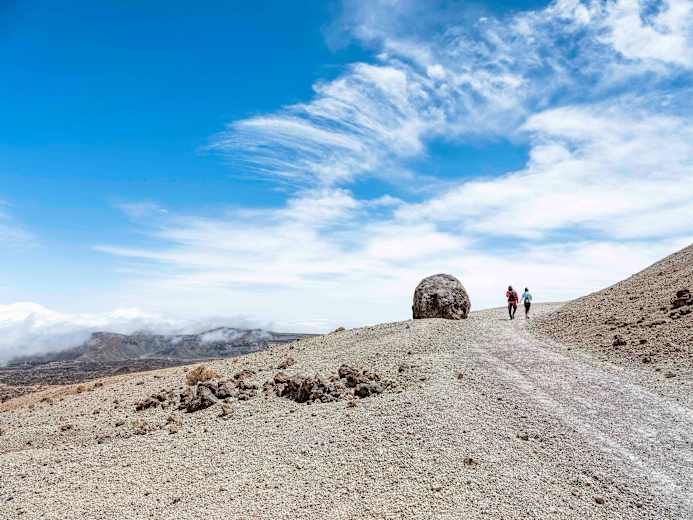 Richtung Gipfel wird es immer gerölliger und der Weg erfordert Aufmerksamkeit - vor allem im Abstieg. Große, runde Kugeln aus Lava - die so genannten „Teide-Eier" - säumen den Weg Richtung Gipfel.
