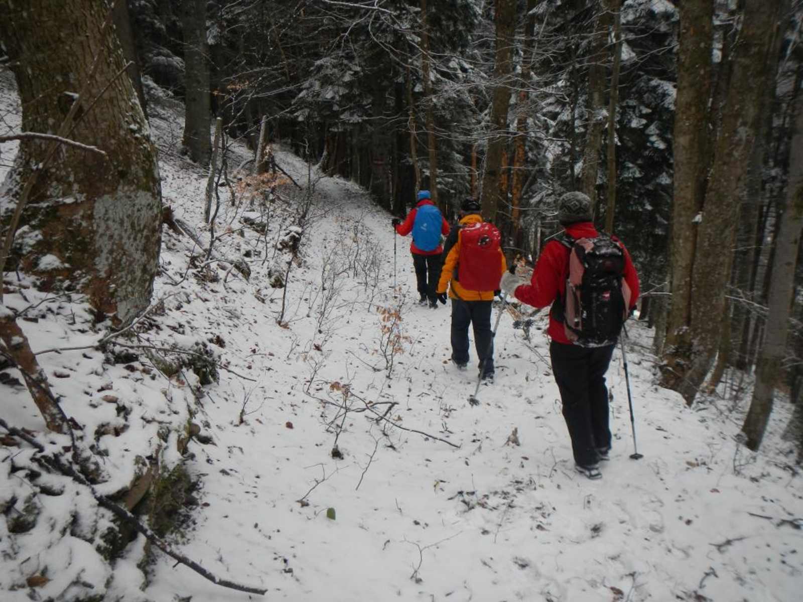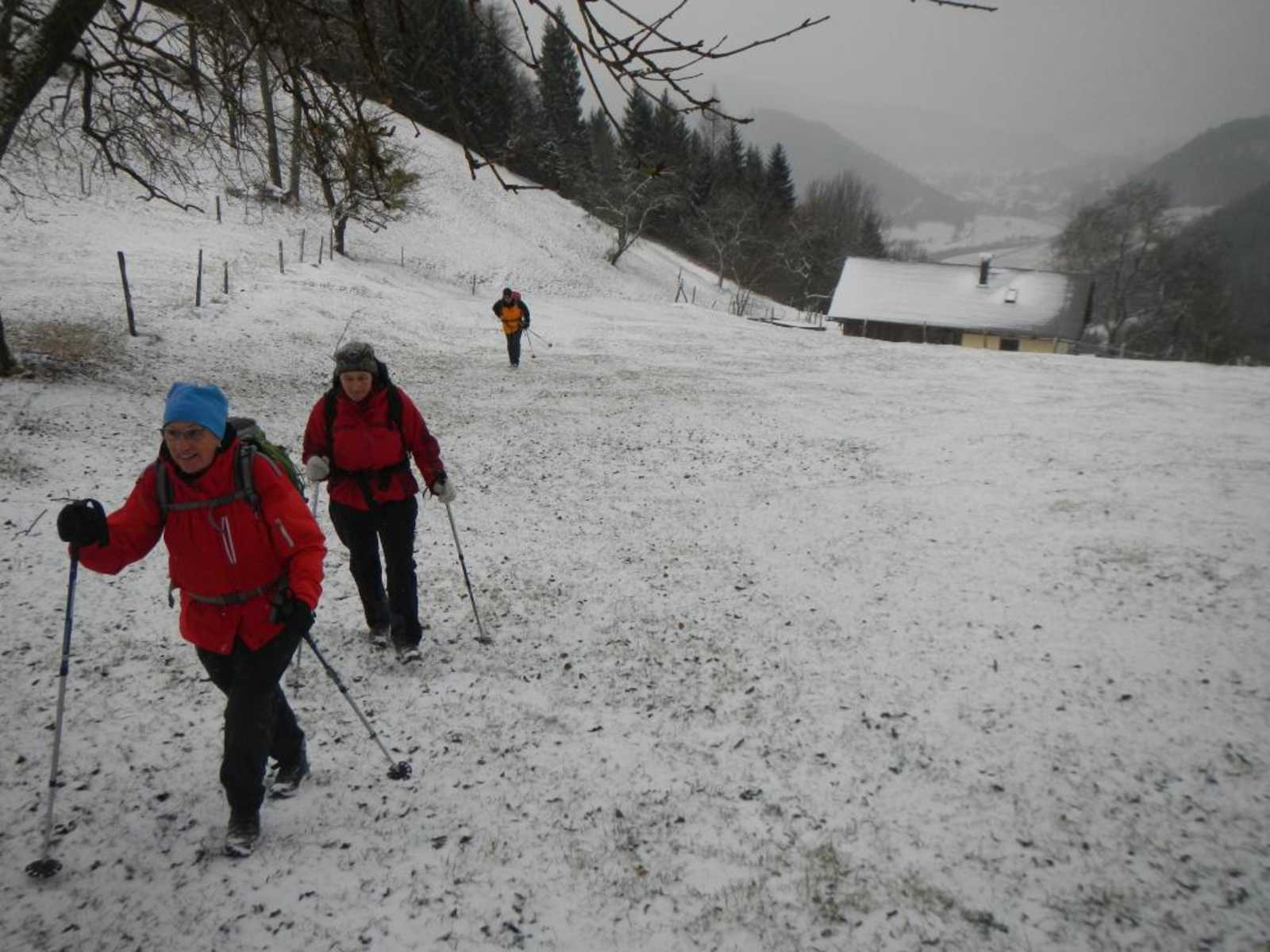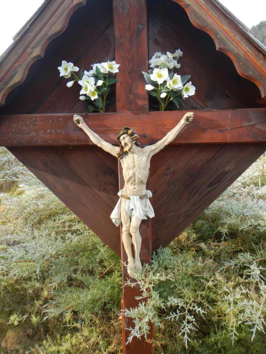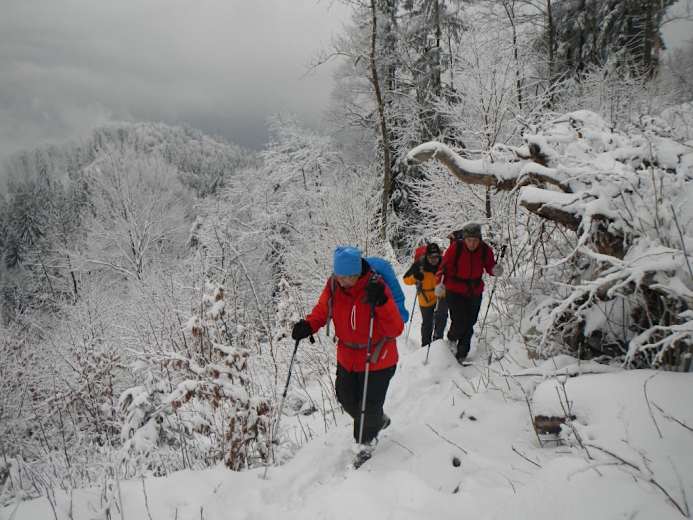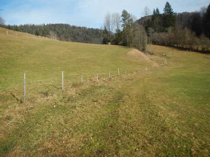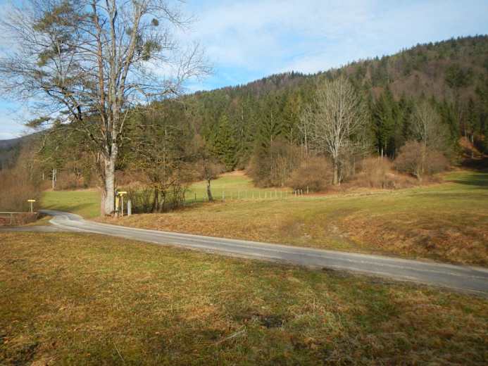 Zuerst über eine Wiese und auf einem alten Karrenweg den Hang hinauf bis zu einem breiten Kamm, den man nach links verfolgt. Vorbei an einem neuem Wegkreuz zu einer Jagdhütte und dahinter auf einem Fahrweg ziemlich eben zu einer markanten Kurve.