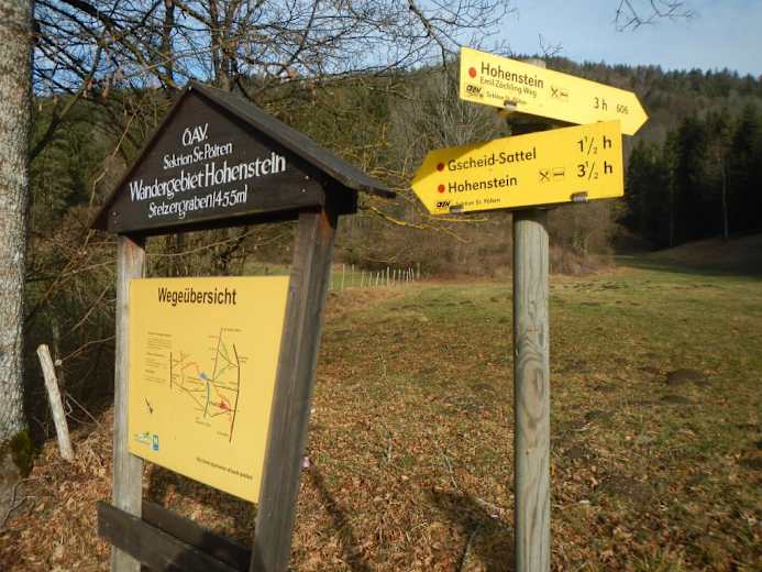 Der Emil-Zöchling-Weg führt als aussichts- und abwechslungsreicher Weg über Wiesen, Wald und auch felsige Abschnitte auf den Hohenstein (1.195 m) und das Otto-Kandler-Haus.