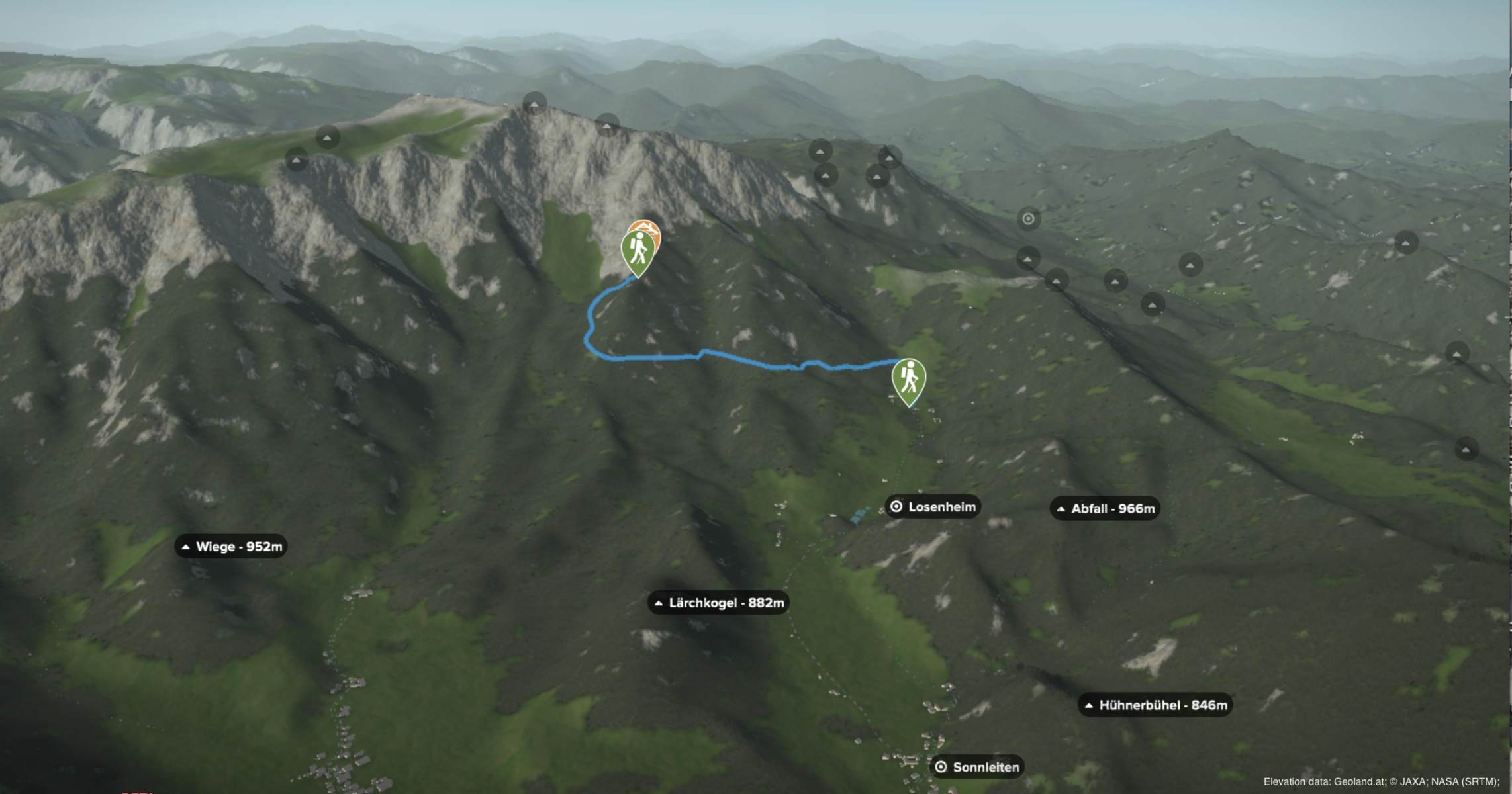 Es geht durch den Nandlgraben weiter. Am Wegweiser hält man sich rechts zur Ferdinand Bürkle Rettungshütte, schwingt sich noch ein paar Höhenmeter aufwärts und zweigt dann links zur Rieshütte ab.