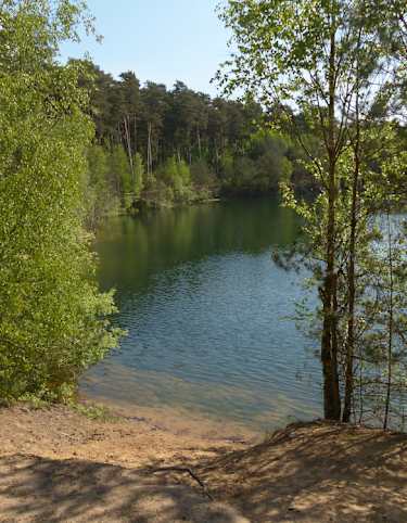 Vorbei am „Breiten Teich“ und am „Königsteich“ geht es zum Parkplatz von Haus Marck, von dem sich die Route stramm bergan schwingt.