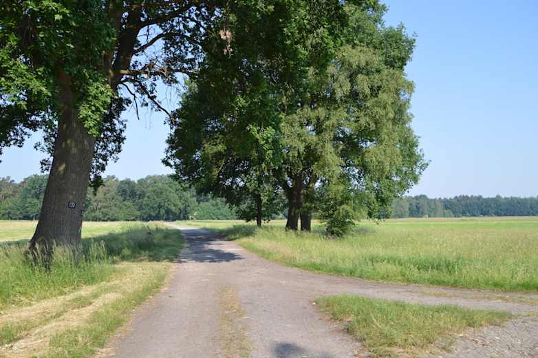 Weg durch ein Waldstück, dann folgt er wieder dem Waldrand und gibt dabei Gelegenheit, den Blick über die weiten Felder schweifen zu lassen.