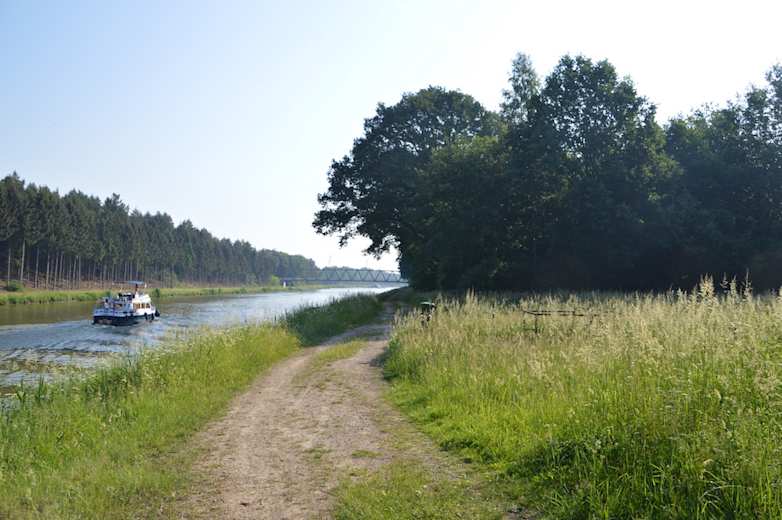 Der Start zur Runde befindet sich am Campingplatz Weisses Moor in unmittelbarer Nähe zum Mittellandkanal, der über einen kurzen Stichweg erreicht wird. An einem kleinen Bootsanleger lassen sich die vorbeifahrenden Schiffe trefflich beobachten. Doch das gelingt ebenso vom bequemen, leicht befestigten Uferweg, dem die Route nun nach links folgt.
