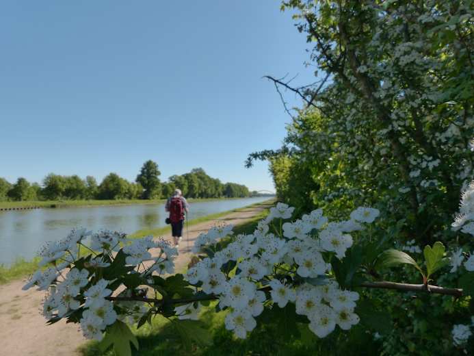 Am Parkplatz in der Dorfstrasse in Steinbeck, gegenüber der Kirche, beginnt die Steinbecker Runde, die am besten im Uhrzeigersinn gelaufen wird. Daher steht nach Querung der Recker Strasse auch zunächst die Passage am Mittellandkanal an: auf dem bequemem, von Büschen gesäumtem Uferweg lassen sich geruhsam die Schiffe beobachten, während es ostwärts geht.