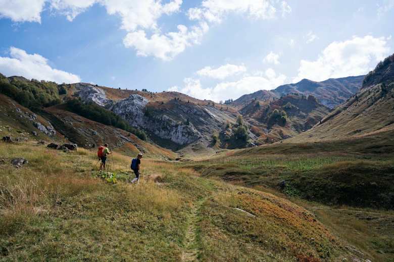 So ist bald auch der zweite Gipfel erreicht: die Talijanka auf 2.056 m. Sie erinnert mit ihrem Namen, der übersetzt „italienisches Mädchen“ heißt, an die italienische Division, die hier, im Grenzgebiet von Albanien und Montenegro, während des Zweiten Weltkriegs stationiert war. Hinter einem liegen noch die schroffen Gipfel der prominenten Felsriesen, vor einem bereits eine deutlich lieblichere Landschaft. Durch diese führt der Abstieg, bereits auf albanischer Seite. Sanft begraste Hügel dominieren nun das Bild. Vorbei an weidenden Schafen und begleitet von einem Licht, das fast noch wärmer scheint als das toskanische. Wie unter einem goldenen Filter liegen die faltigen Hügel, die allmählich wieder in Wald übergehen. Der letzte Abschnitt führt mitunter wieder etwas steiler stetig durch nun immer dichter werdenden Wald talwärts, ehe man das kleine Bergdorf Lëpushë erreicht. Ein Dorf wie aus dem Bilderbuch am Fuße des Prokletije-Gebirges. Wie zufällig hineingewürfelt stehen einige wenige Häuschen auf der Hochebene verteilt. Mit dem Guesthouse Alpini findet man in einen von ihnen Unterkunft.