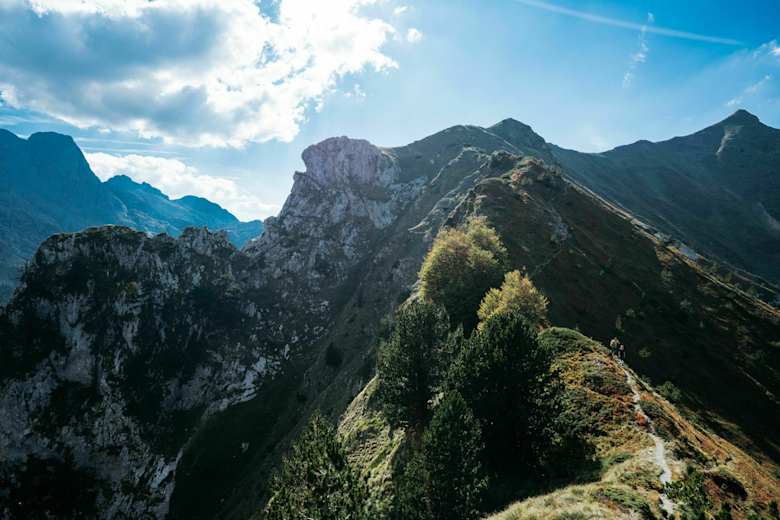 Nachdem man diesen Anblick ausgiebig genossen hat, folgt man dem schmalen Pfad weiter entlang des Kamms - und balanciert damit in weiterer Folge - im wahrsten Sinne des Wortes - zwischen zwei Ländern. Der Kamm des Prokletije-Gebirges im Grbaja-Tal markiert die Grenze zwischen Montenegro und Albanien. Hier warten etwas anspruchsvollere Passagen auf, gibt es doch vereinzelt ausgesetzte Stellen mit steil abfallendem Gelände auf beiden Seiten. Der Ausblick entlohnt allemal: gleich zwei Länder hat man im Blick, garniert von einer Felskulisse, die wirklich sprachlos macht.