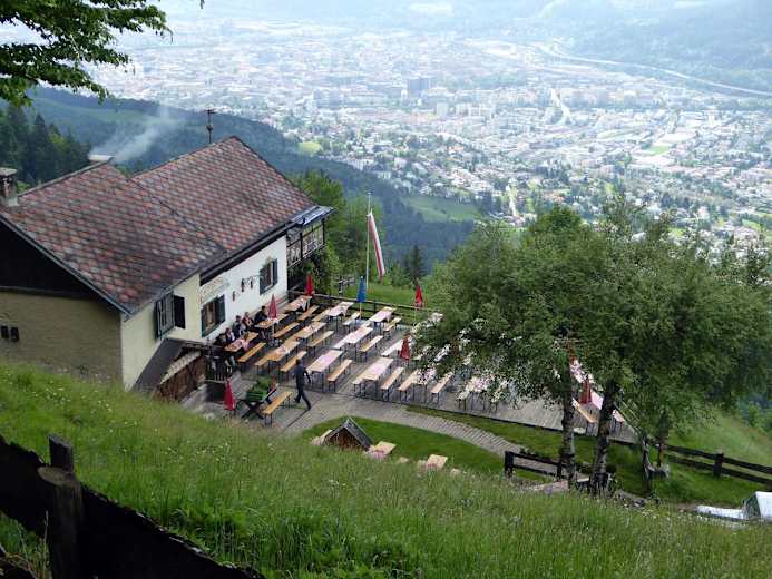Das Almgasthaus Rauschbrunnen liegt wunderschön oberhalb von Innsbruck, umgeben von einem abwechslungsreichen Bergmischwald und Wiesen. Der Blick auf die Stadt und weit nach Süden ins Wipptal, die Tuxer und Stubaier Alpen ist grandios. Viele Innsbrucker radeln, wandern oder laufen noch am Abend nach der Arbeit gerne hinauf zum Rauschbrunnen, gönnen sich ein kühles Bier und genießen die lauen Sommerabende. Dabei gibt es viele verschiedene Möglichkeiten, um zum Almgasthaus zu kommen. Hier ist nicht der kürzestes, aber dafür ein ganz besonders schöner und abwechslungsreicher Anstieg beschrieben, der außerdem am Ausgangspunkt einen Parkplatz zu bieten hat. Ansonsten ist die Anreise mit dem Öffis auf jeden Fall besser.