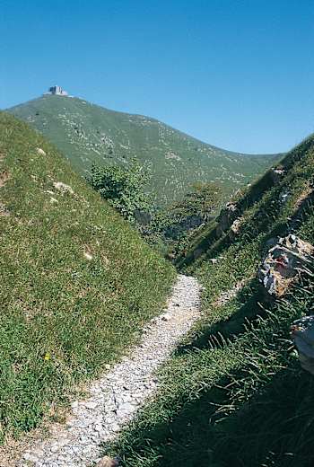 Dann läuft man auf einem erdigen Kammweg des grasigen Südausläufers steil bergan zum Forte Diamante (672 m). Von der Festung steigt man schließlich auf dem Ostkamm (alte Markierung: Strich und 3 Punkte) ab zum Passo di Costa Pino (392 m) (Bushaltestelle, Bar-Ristorante "Baita Diamante"). Wer von hier per Bimmelbahn nach Genua zurückfahren möchte, erreicht auf der Straße östlich der Gleise nach 200 m Richtung Nordosten den Bahnhof Campi.