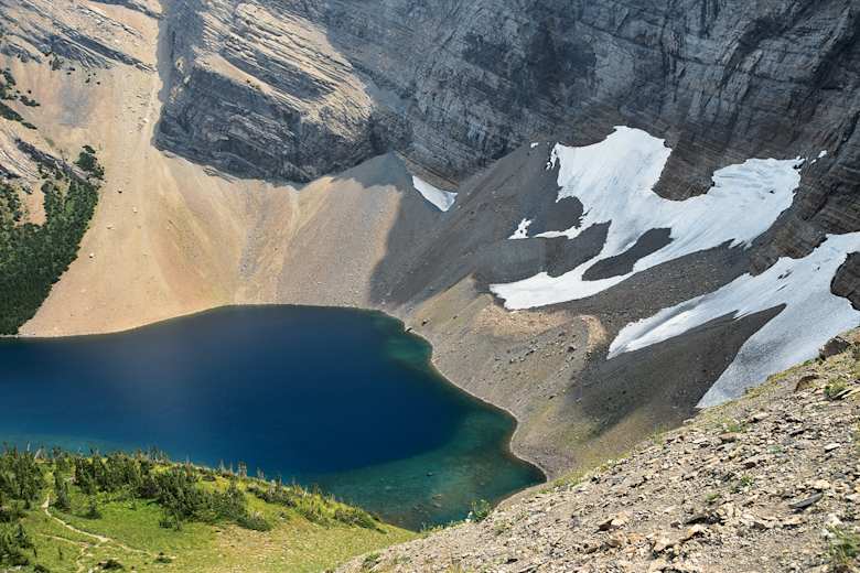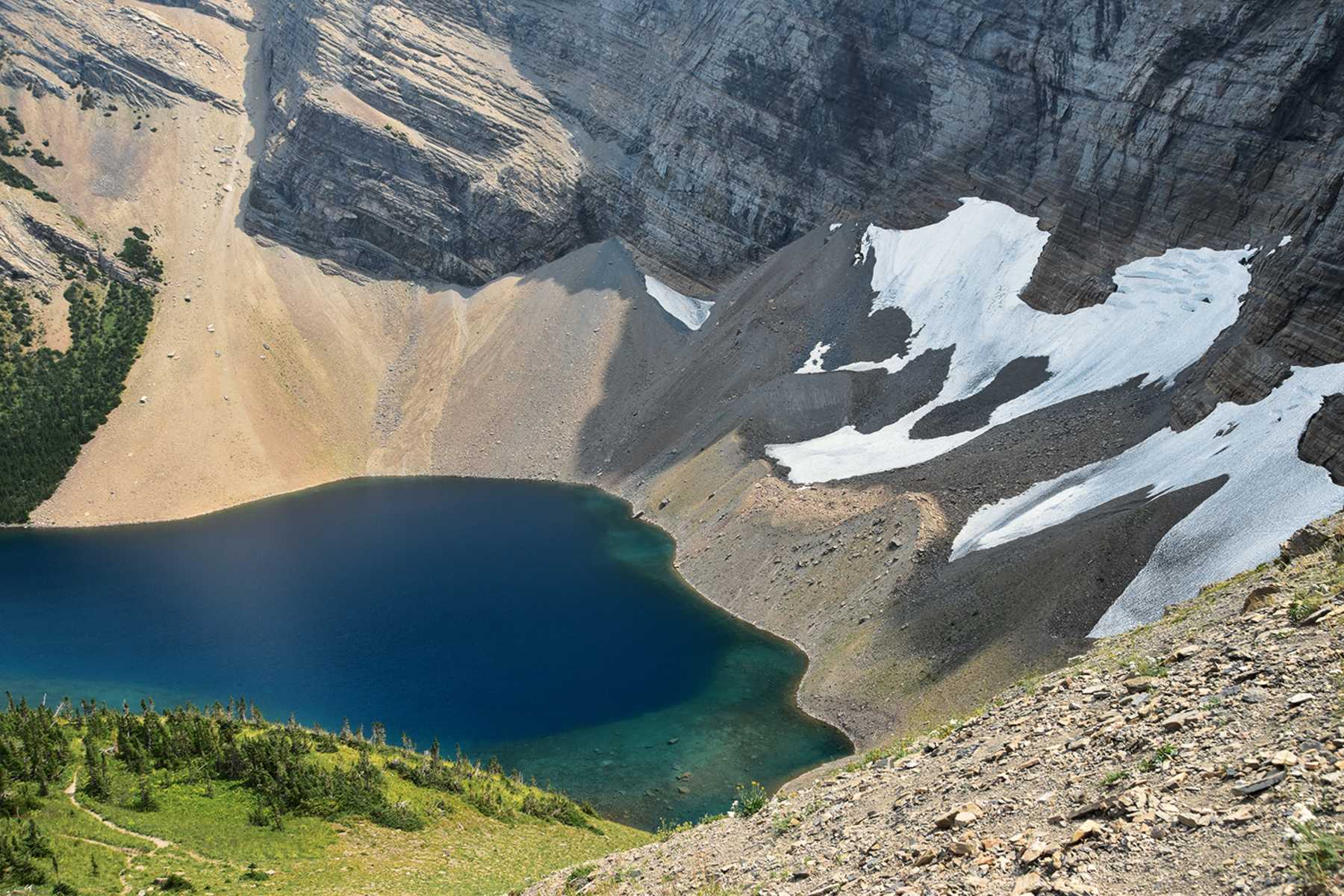 Ab jetzt wandert man hinab, folgt dem Trail nordöstlich ins friedvolle Tal der Quellseen des Carthew Creek. Von der Gabelung zum tiefblauen Alderson Lake (1.880 m) welcher definitiv einen Besuch lohnt, gelangt man nach einem 7 km langen, von Nutka-Himbeeren (Thimbleberries) und Holunder gesäumten Waldweg zurück nach Waterton Park und zu den Cameron Falls (1.310 m). Das letzte Wegstück führt am Zaun eines Wasserfalles entlang, nach dem man sich links hält, um zum Aussichtspunkt am Straßenrand zu gelangen.
