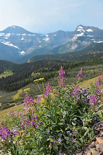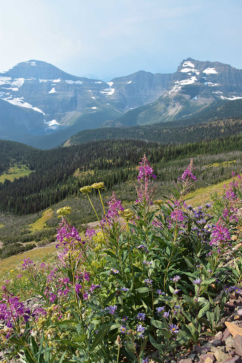 Zunehmend öffnet sich die Sicht auf die umliegenden Berge, Waldweidenröschen und niedrige Bodendecker lösen die vorherige Vegetation ab, bis man in wenigen, von orangefarbenen Wegmarkern gekennzeichneten Serpentinen und etwas steilerem Gefälle den Pass namens Carthew Summit (2.310 m) erreicht. Ein kurzer Abstecher rechts auf die Felsnase entlohnt mit umfassenden Ausblicken auf die gletscherbedeckten Gipfel des Glacier National Park.