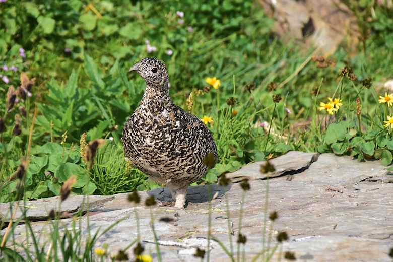Ein sehr neugieriges Weißschwanz-Schneehuhn im Sommergewand. Foto: Verena und Analena Schmidt