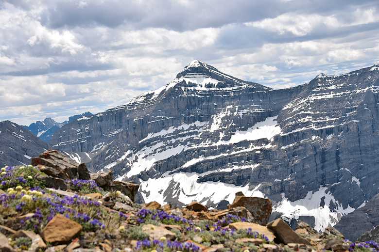Endlich beginnt die spannende Kammwanderung. Man hält sich direkt auf den oben vor einem liegenden, mächtigen Felssporn zu und kraxelt, dort angekommen, links unter seiner Spitze vorbei. Nun ist die Sicht frei auf den Gipfel. Um ihn zu besteigen, darf man zuvor durch einen Märchengarten an schroffen Felsformationen sowie über einen wie von Zauberhand in ein Blumenmeer verwandelten Frostschutthang, bis man nach einem letzten Anstieg den Gipfel des Mt. Allan (2.819 m) erreicht.