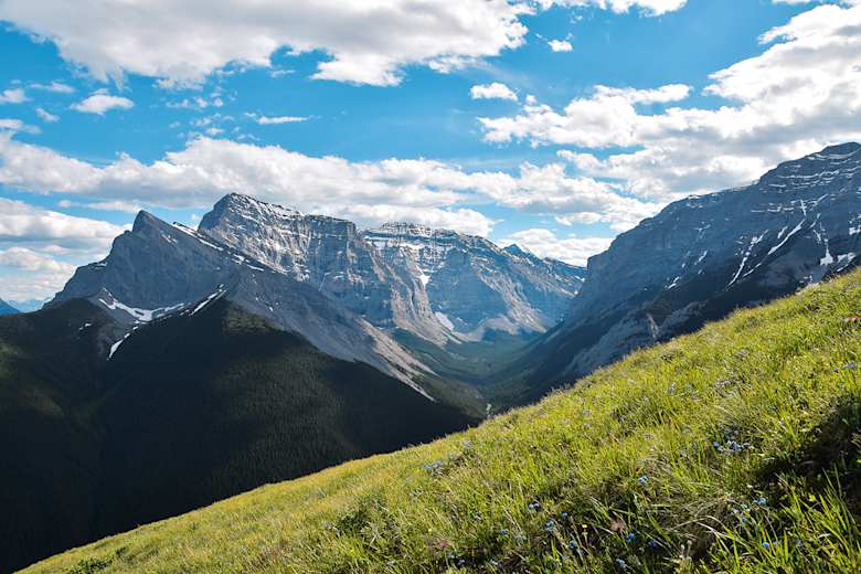 Blick vom grasbewachsenen Steilhang ins Trogtal des Ribbon Creek. Foto: Verena und Analena Schmidt