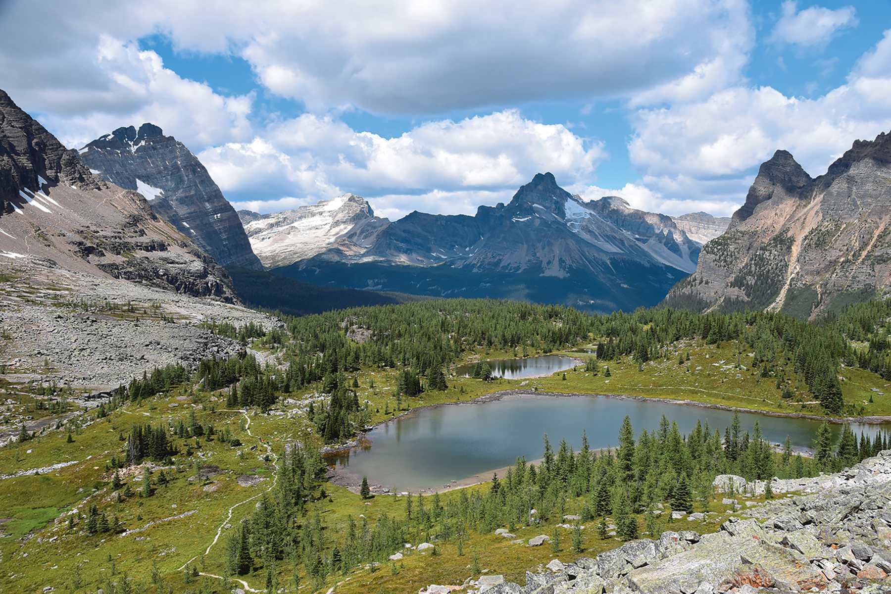 Das nächstes Ziel heißt Opabin Prospect (2.130 m). Dazu hält man sich auf dem Wiesenweg gen Westen und hüpft über einen Bach, wobei man nach 1,3 km dem Wegweiser geradeaus folgt und auf dem verschlungenen Pfad durch feuchten Lärchenwald bis zur exzellenten Aussichtsplattform am Felsabbruch wandert. Hier biegt der Pfad, an einem weiteren Aussichtspunkt vorbei, in die Gegenrichtung ein.
