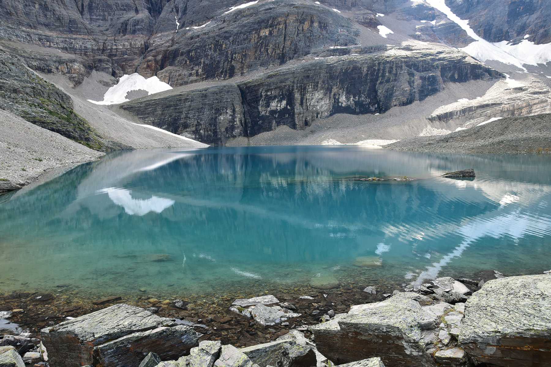 Nun wird’s steinig-alpin, wenn man sich am Westende des Sees an die Nordflanke des Yukness Col begibt und am steinernen Felsmassiv dem blau-gelben Zeichen eine Dreiviertelstunde lang ins nächste Tal folgt. Entlang des Steilhanges Richtung Westen ergeben sich tolle Aussichten auf das Tal um Lake O’Hara. Kurz bevor man auf den Hungabee Lake stößt, folgt man den Markierungen im Geröllfeld, um den Erdpfad zu erreichen, auf dem man links binnen weniger Minuten zum Opabin Lake (2.290 m) hinaufsteigt.