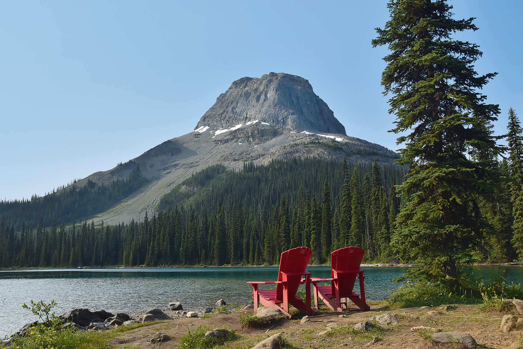 Die offiziellen roten »Parks Canada«-Sessel mit Blick auf den Wapta Mountain. Foto: Verena und Analena Schmidt Oberhalb der Twin Falls überbrückt ein Steg den kleinen Bach. Ideal für eine Pause! Foto: Verena und Analena Schmidt Die Twin Falls im Yoho Nationalpark. Foto: Verena und Analena Schmidt Bildergalerie (3)