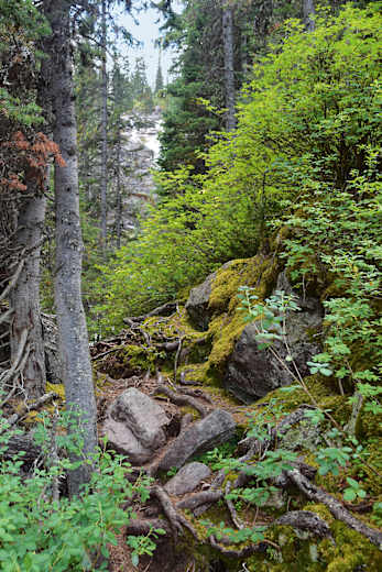 Auf dem noch sichtbaren Pfad quert man dieses am unteren Rand. Der offensichtliche Waldpfad links hinab kurz nach dem quer liegenden Baumstamm ist ein Abstecher zu einem versteckt liegenden Wasserfall, von dem man steil zum Hauptweg zurückkehren kann, oder man bleibt auf dem nun kleiner werdenden Pfad und folgt diesem hinauf zur nächsten Gesteinshalde.