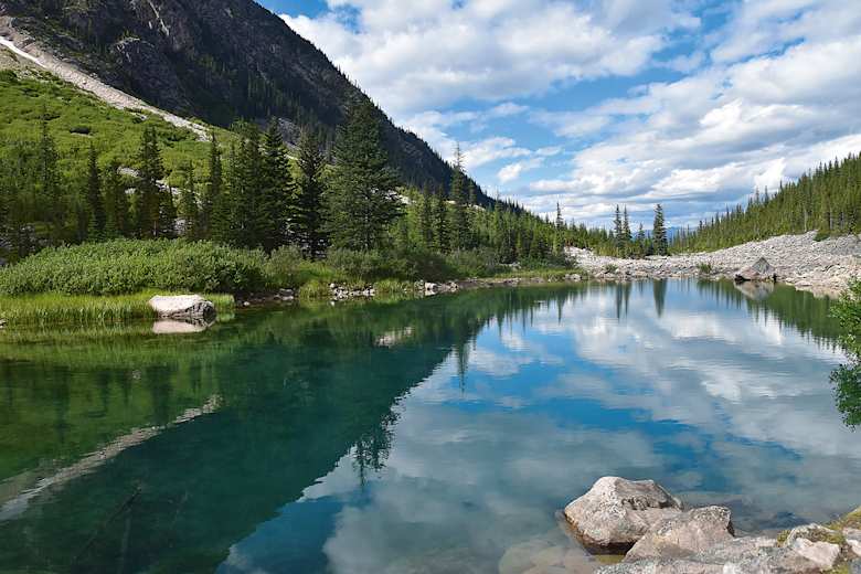 Wiederum hält man sich geradeaus und zweigt nicht links ins Gebüsch ab. Anhand der Inukschuks sucht man aufmerksam den Weg über drei weitere Boulderfelder aufsteigend und stets Richtung Süden. Nach 500 abenteuerlichen Metern weisen einen gelbe Marker den Weg auf die andere Seite des steinigen Bachbettes. An dessen Ostufer gelangt man am Waldrand rechts hinab binnen 10 Minuten, Höhe haltend, zu einer anmutigen Teichoase.