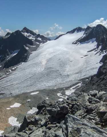 Frühmorgens startet man bei der Krefelder Hütte. Der Krefelder Weg trägt die Nummer 711 und führt teilweise neben dem Sessellift Kristallbahn, der allerdings nur im Winter in Betrieb ist, aufwärts. Auf 2.716 m überschreitet man die Schmiedinger Scharte zwischen dem Kleinen (2.739 m) und dem Großen Schmiedinger (2.957 m).