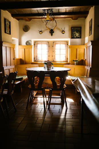Rustikale Gemütlichkeit in der lichtdurchfluteten Gaststube. Foto: Elias Holzknecht, Bergwelten Magazin 02/2017